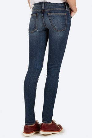 Features a fitted skinny jean meant to hug every curve. Distressed vintage rips and white paint spots in front and back. Cropped at ankle. Made in U.S.A. 90% Cotton/ 6% Polyester/ 4% Elastic