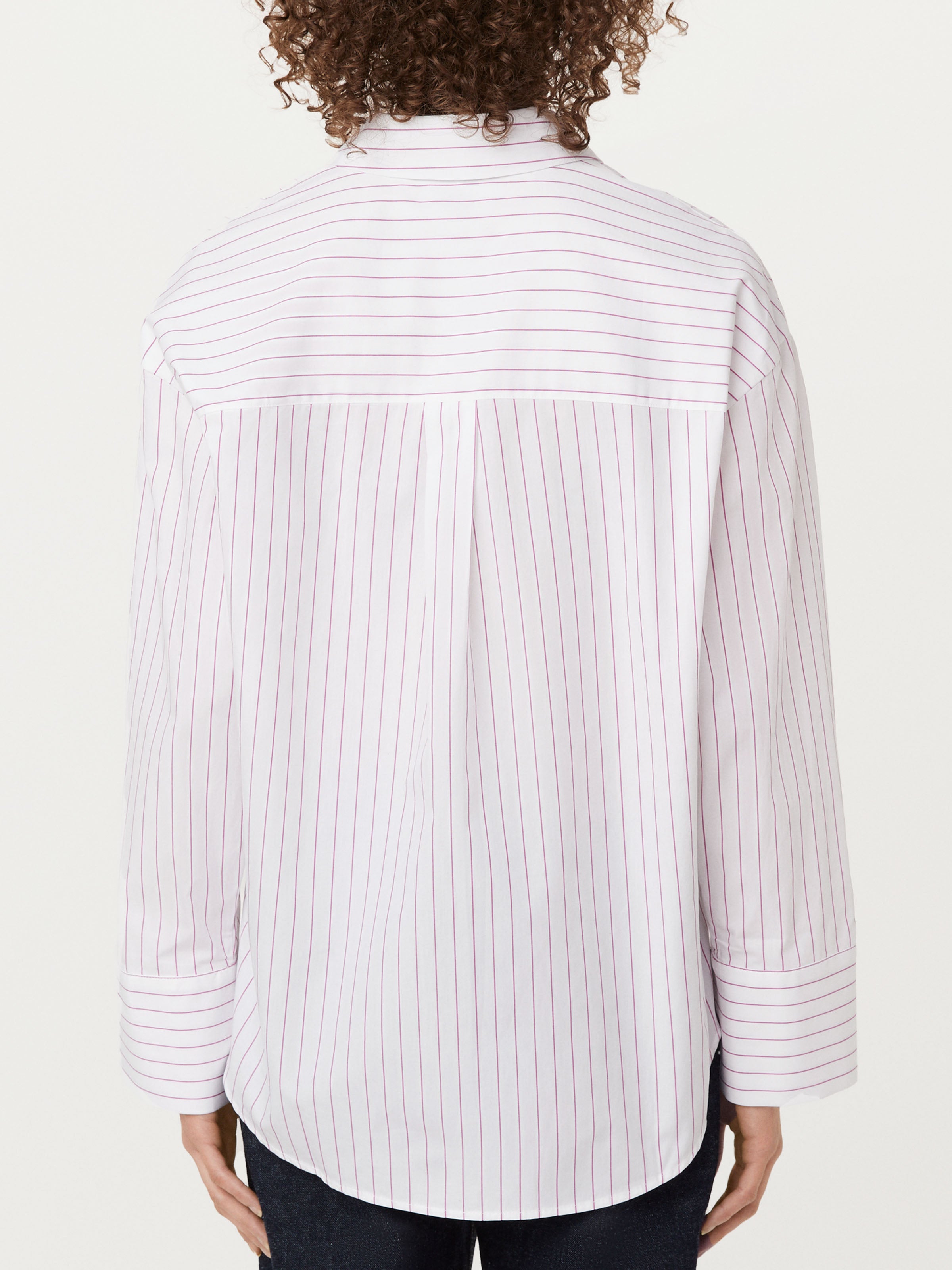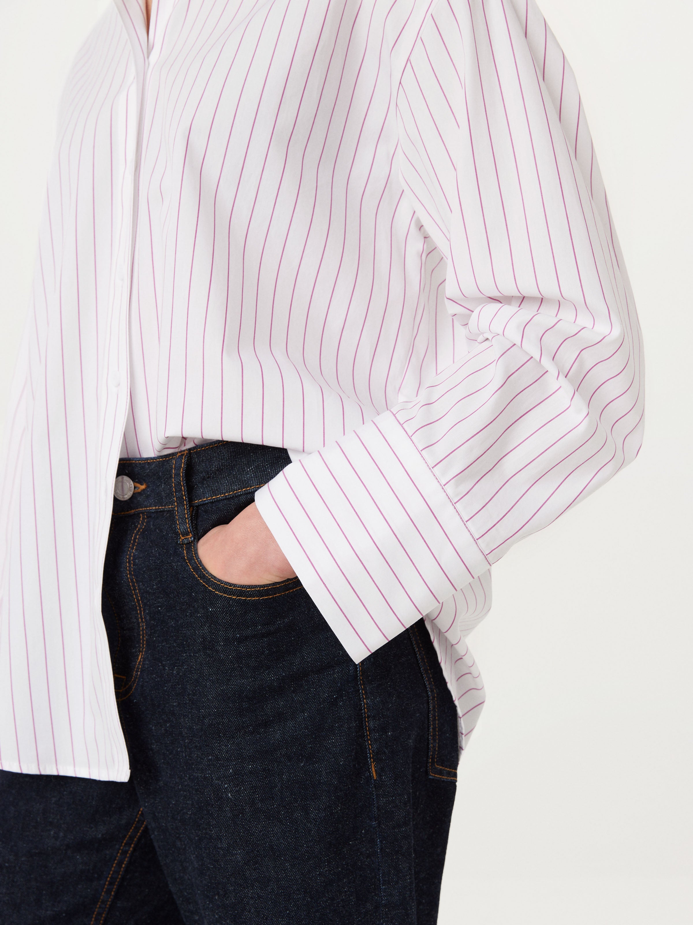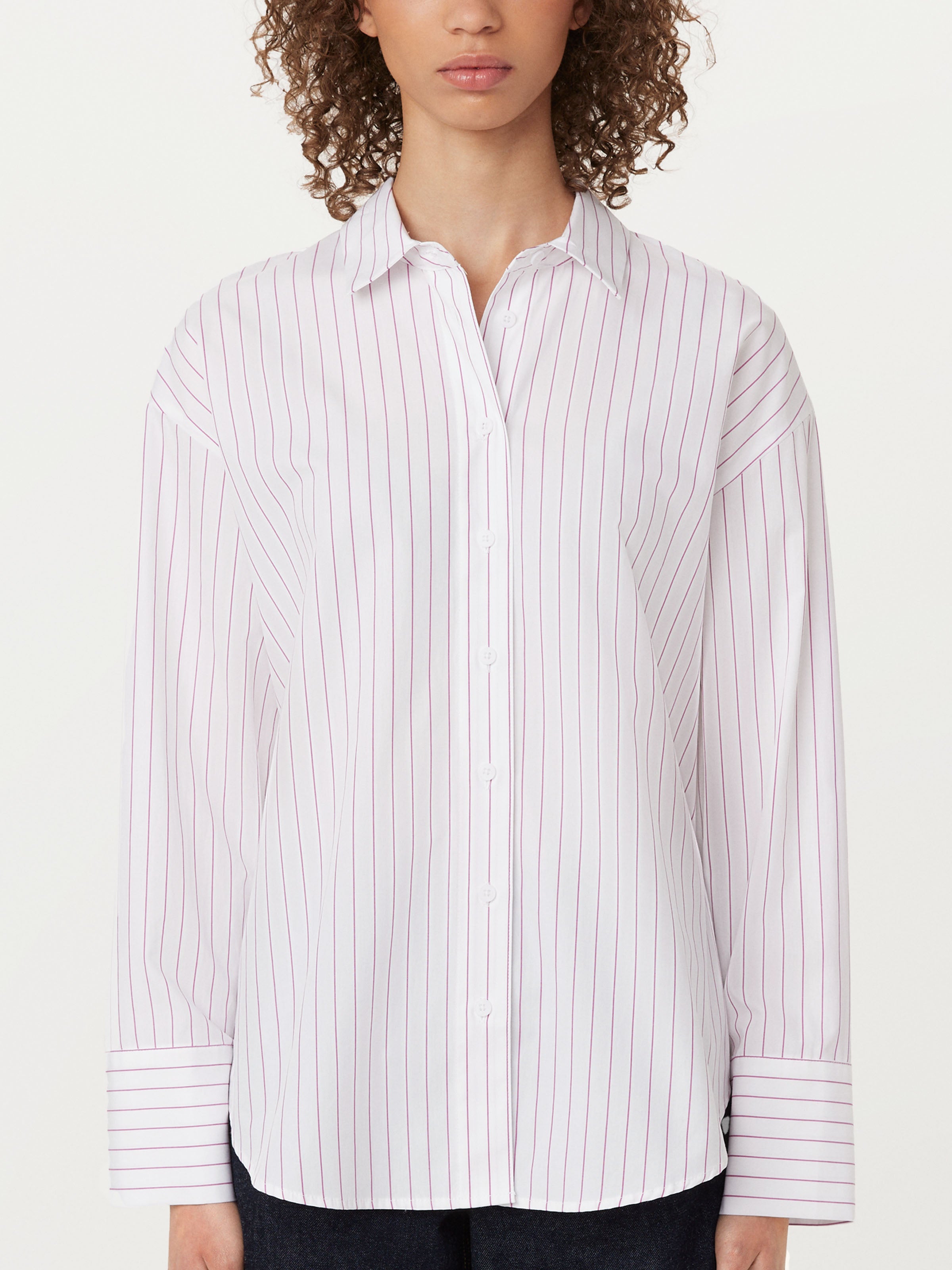 You've found the perfect loose shirt. Made from an organic cotton crisp poplin, features a sleek yet structured look. Loose, boxy fit. Dropped shoulders. Point collar. Front button closure. Long sleeves with wide cuffs. Shirtail hem.