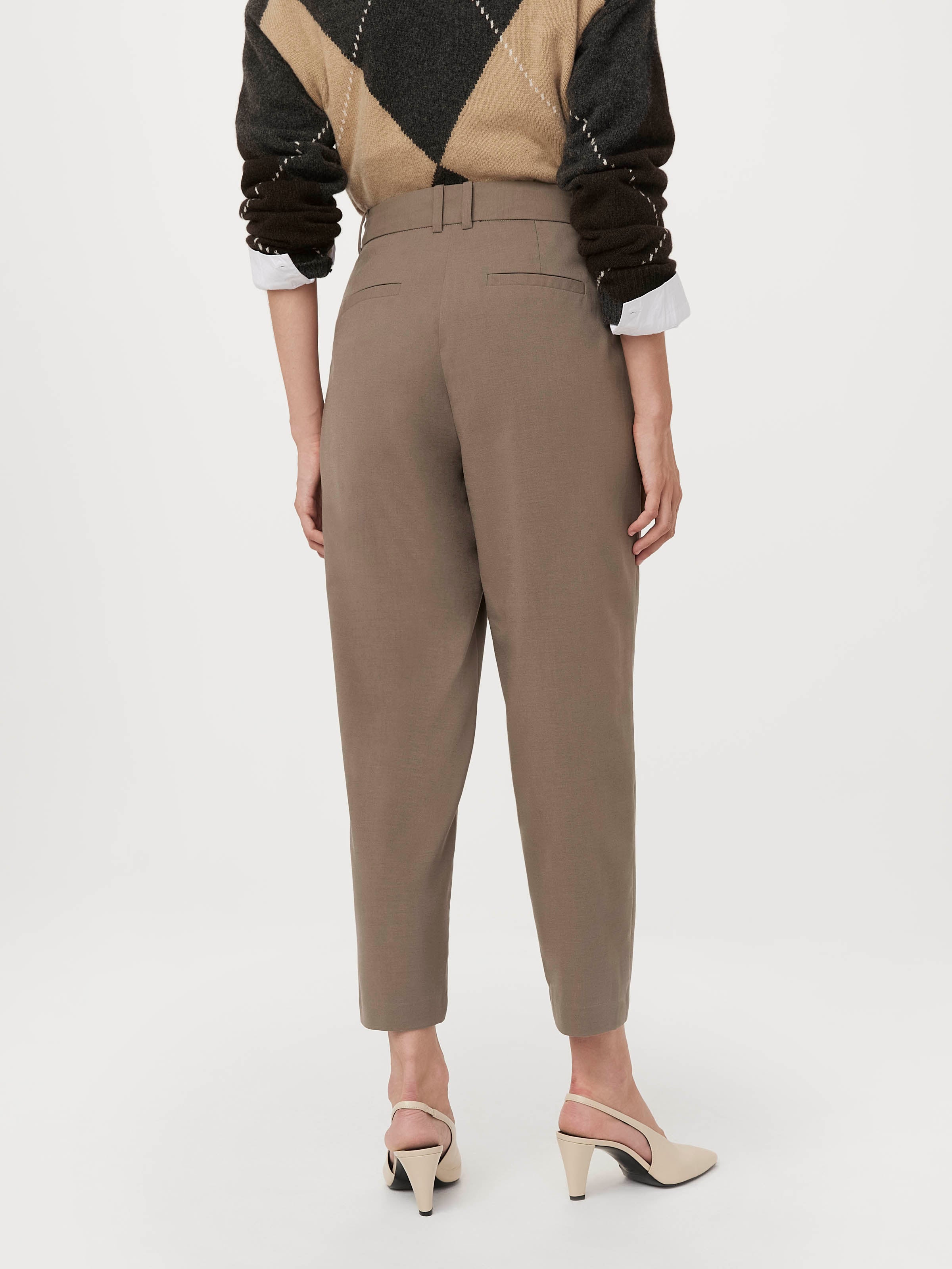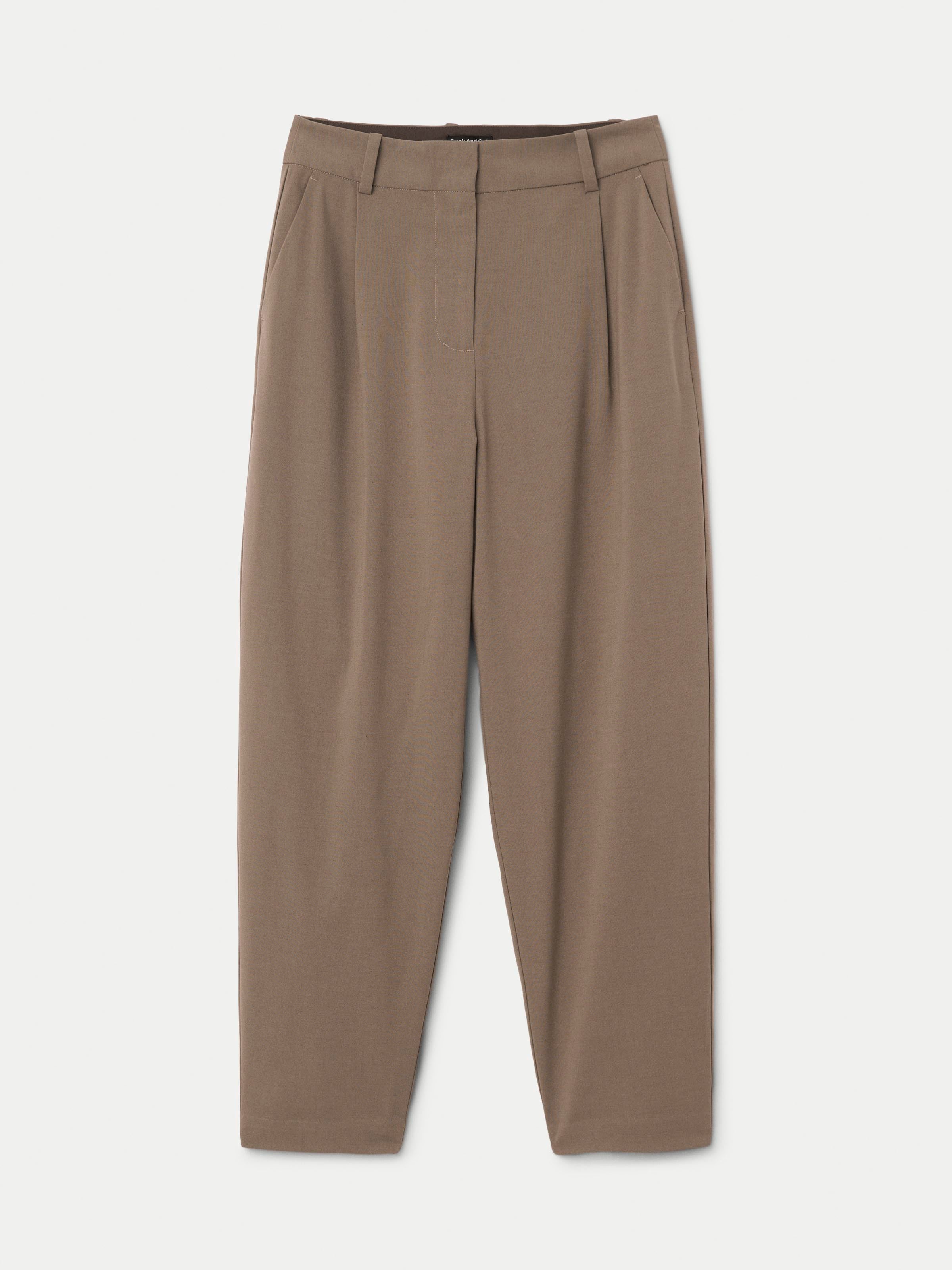 The Amelia pant features a balloon fit, high waist, and ankle-length hem. Fitted at the hips. Loose at the thighs. Tapered from knee to leg opening. Pleated at the front and the waist. Inseam: 27".