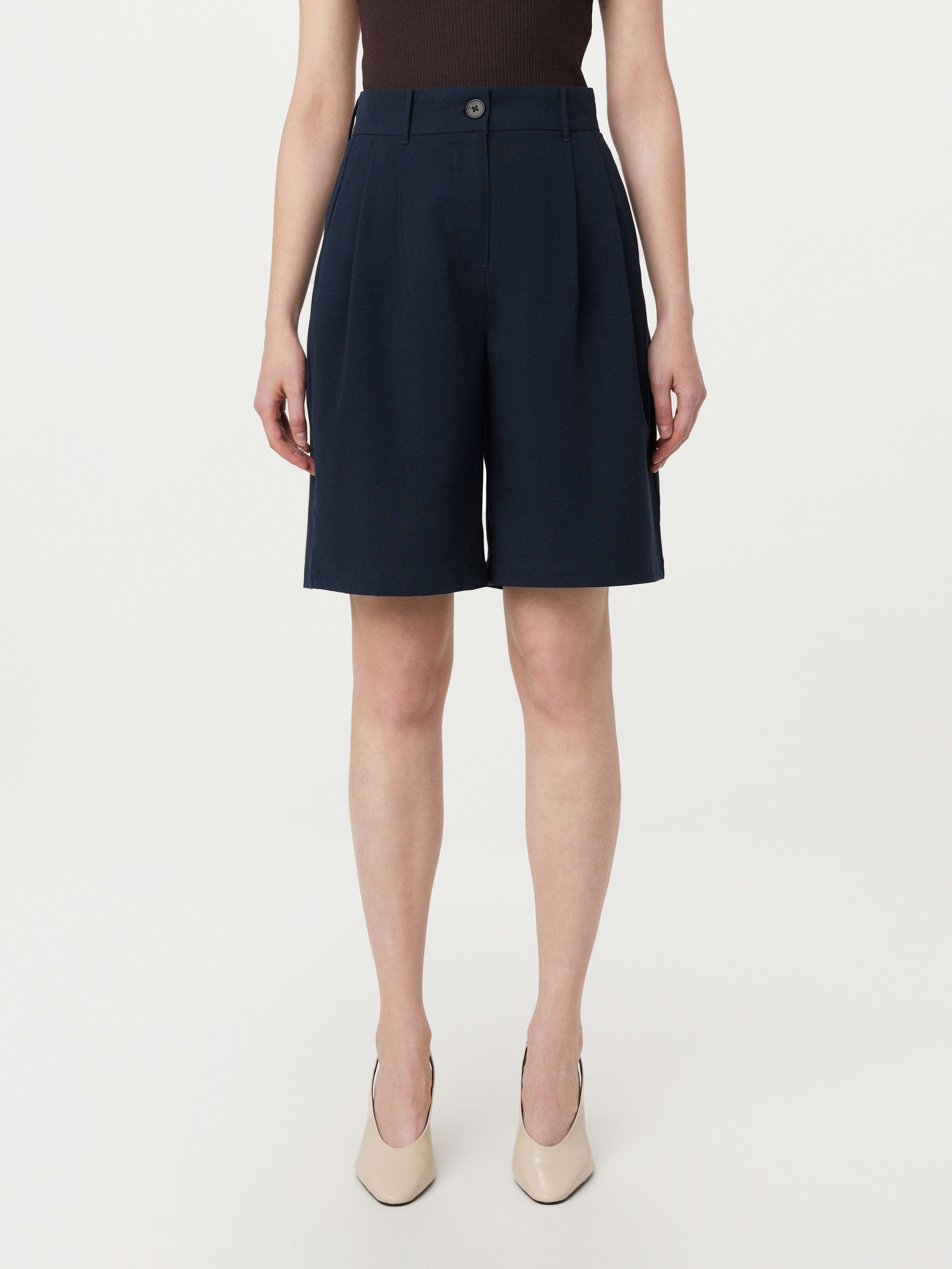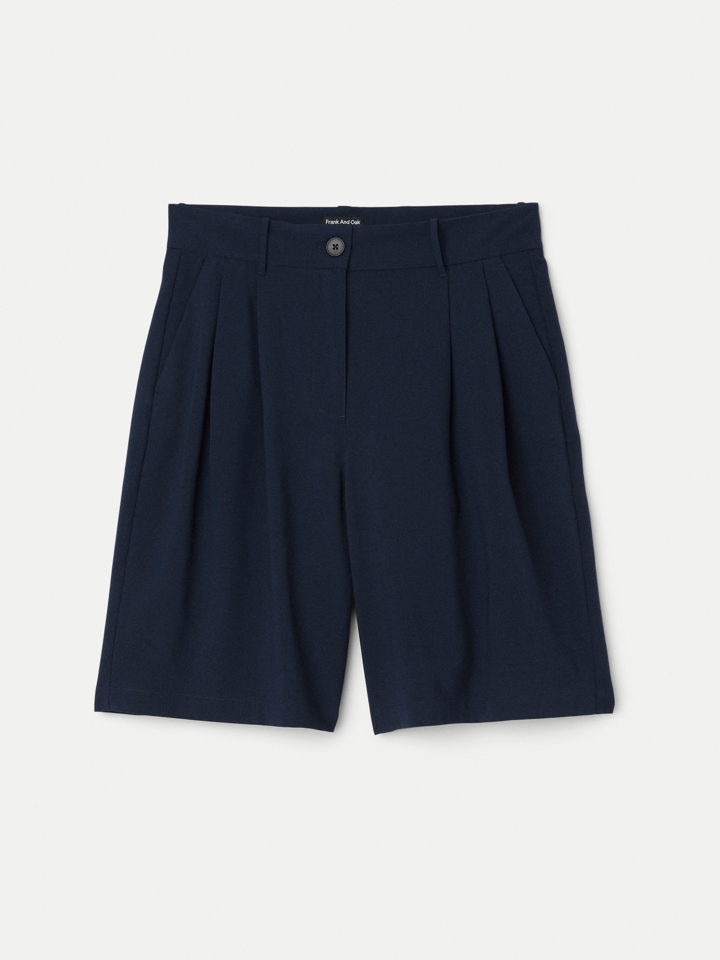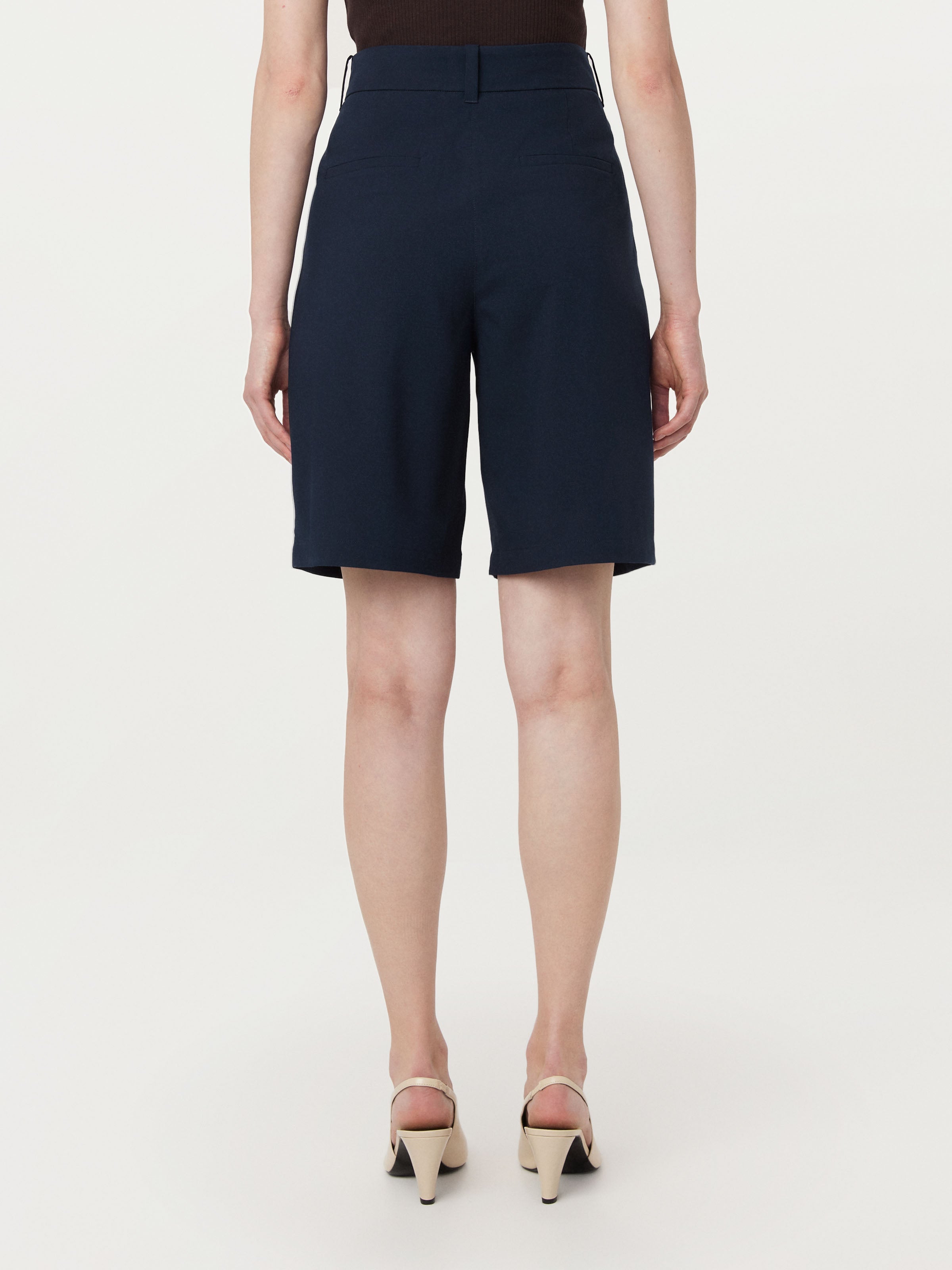 The Celine shorts feature a loose, Bermuda fit, a high rise, and long length. Pleated at front. Straight through the legs. Slash pockets. Faux back welt pocket. Inseam: 9 1/2".