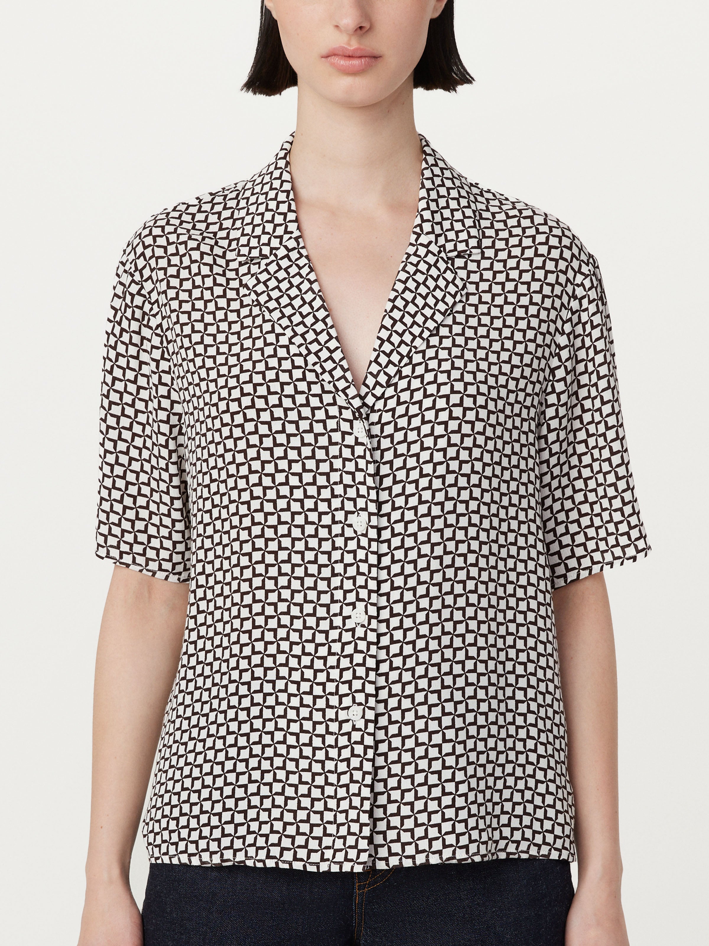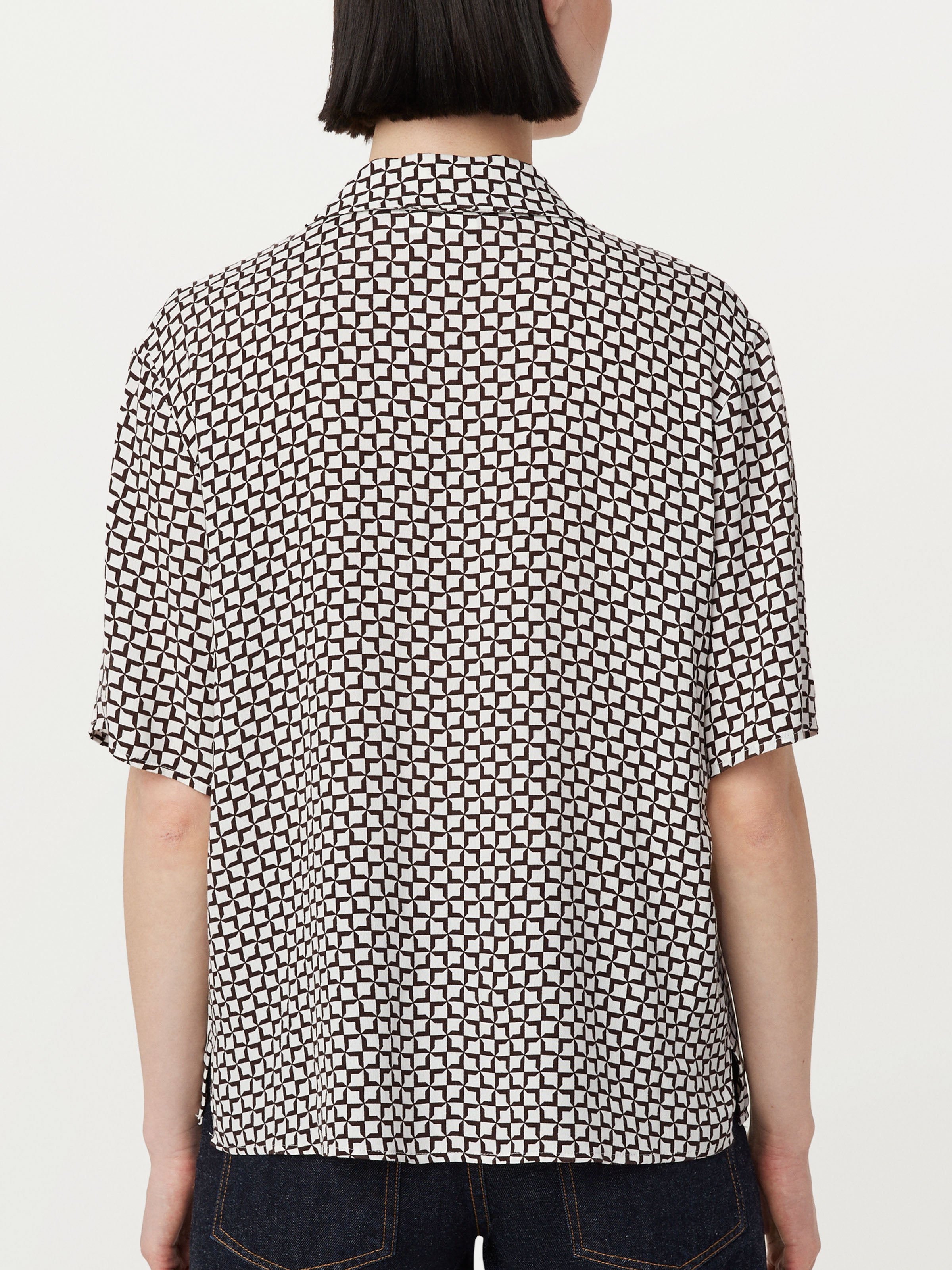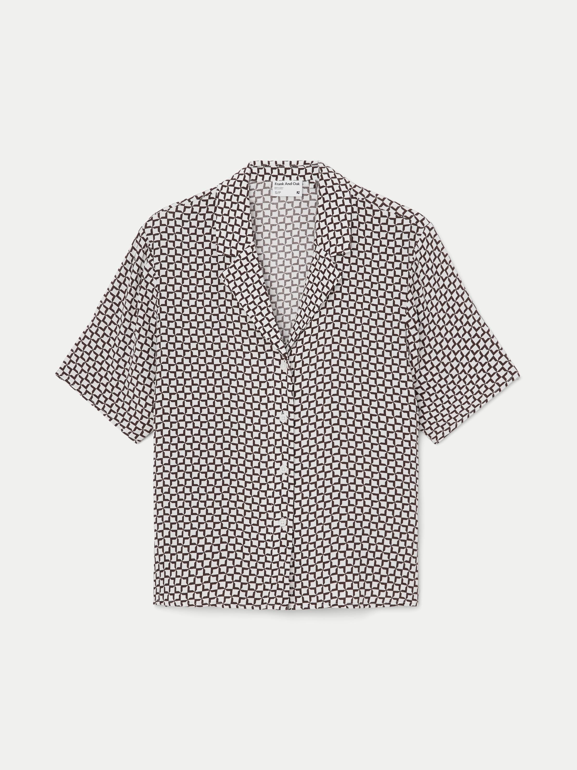 Crafted with LENZING™ ECOVERO™ viscose, a fibre produced with wood pulp from sustainably managed forests. Loose fit. Camp collar neckline. Short sleeves. Features a vintage-inspired geo print.
