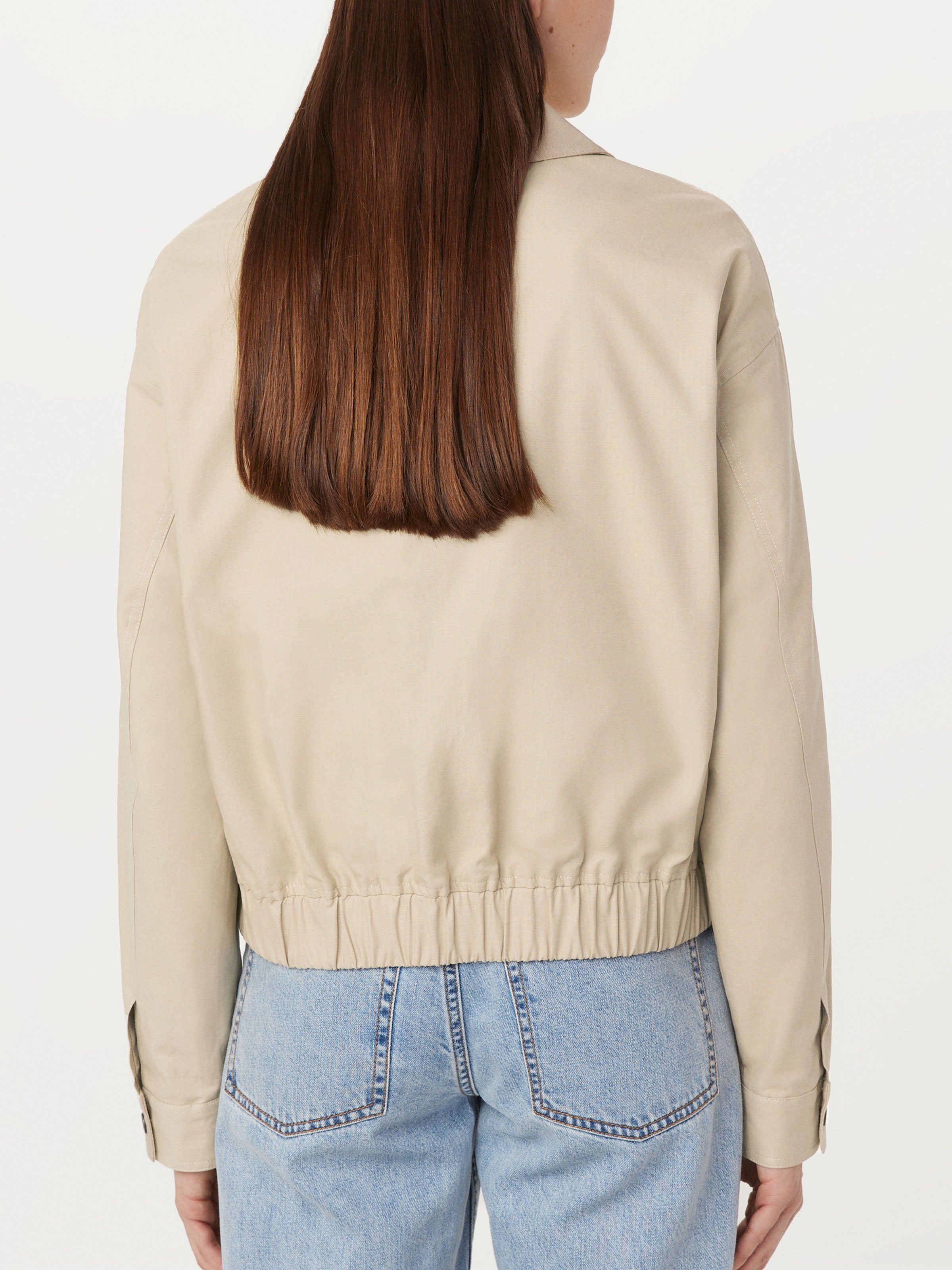 A wardrobe staple. This jacket is made from an organic cotton ripstop fabric. Relaxed fit. Point collar. Zipper front closure. Long sleeves. Dropped shoulders. Elastic at the hem and sleeves.